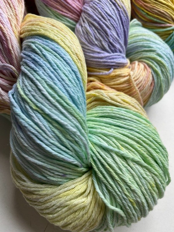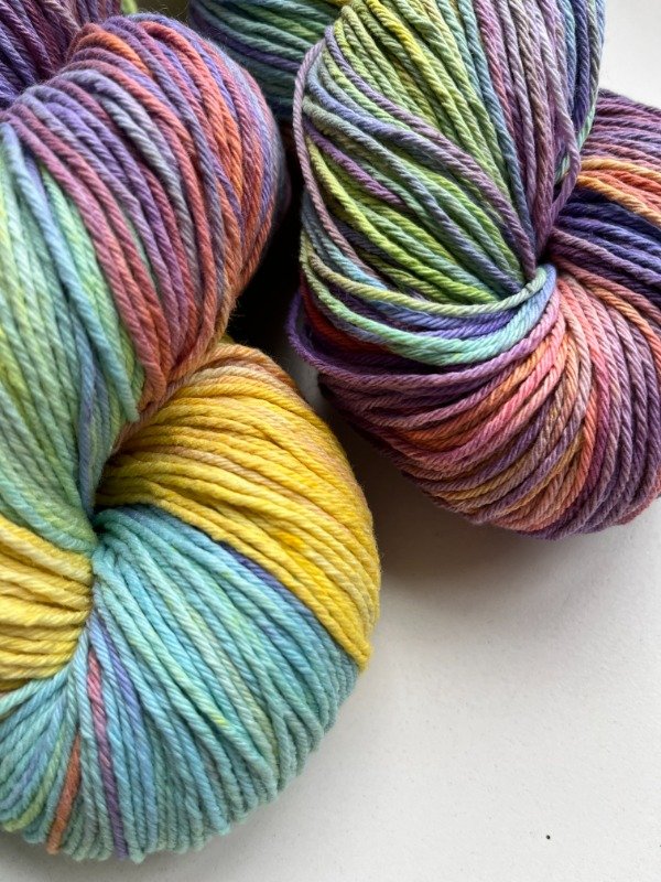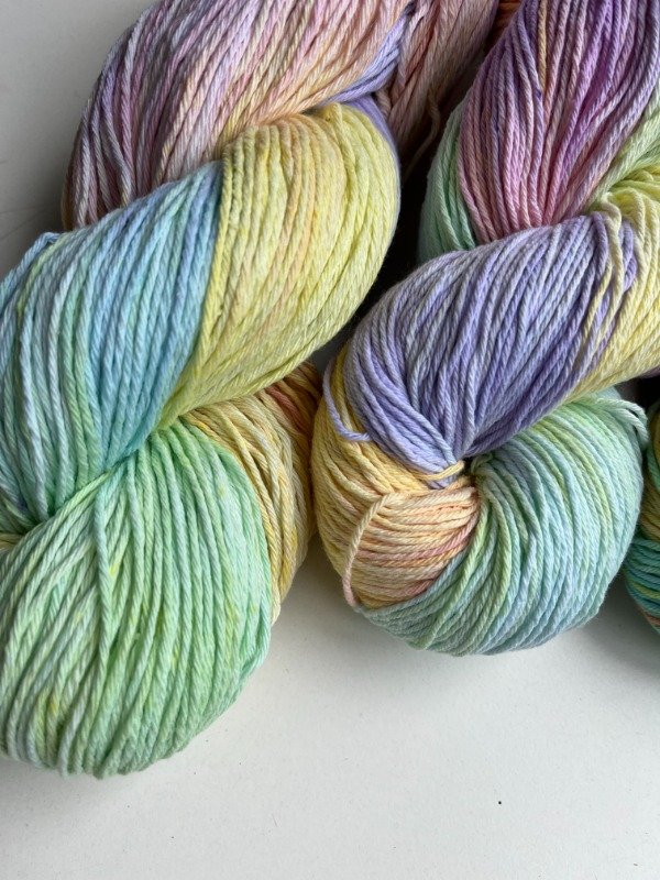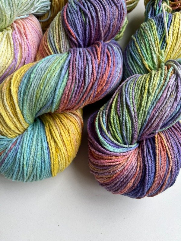 Madejas de algodón teñidas a mano, con los colores vivos del arco iris. Dos grosores: fino y semigrueso, para que elijas entre ligereza o firmeza. Suaves, resistentes y listas para convertirse en bolsos llenos de energía o prendas que te acompañen con alegría. Son hilos que invitan a jugar, crear y disfrutar, como si una amiga te dijera: “animate, tu tejido merece brillar”