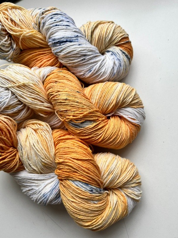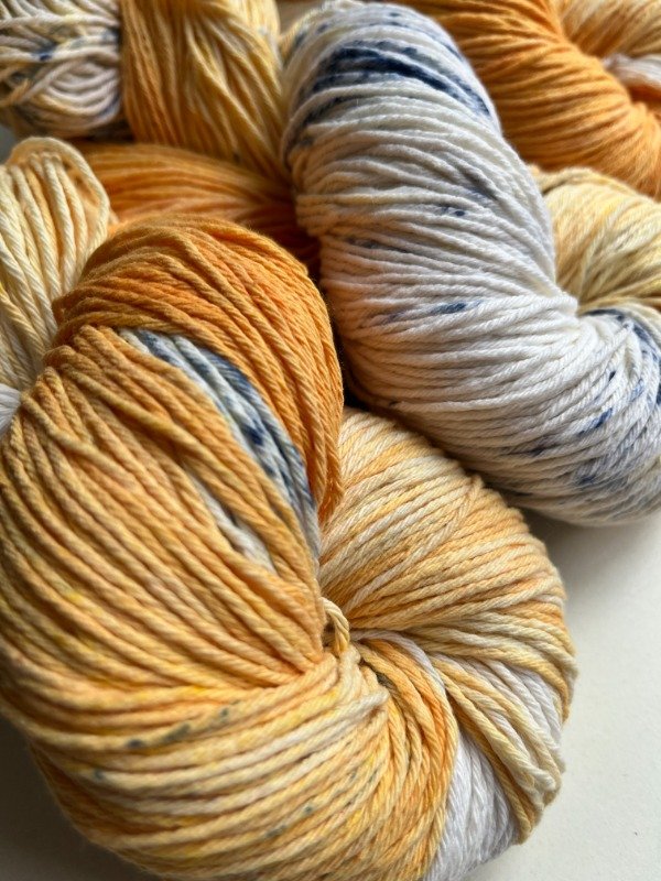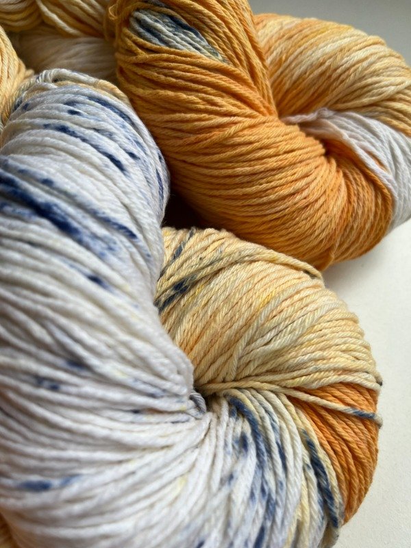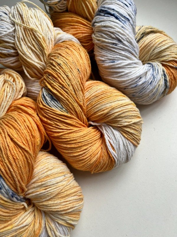 Madejas de algodón teñidas a mano, inspiradas en Monte Hermoso. Los naranjas intensos evocan amaneceres y atardeceres sobre el mar, mientras el azul recuerda esas gotitas frescas que salpican la orilla. Dos grosores —fino y semigrueso— para que elijas entre ligereza o firmeza. Perfectas para tejer bolsos con carácter o prendas que lleven en sus hilos la magia de la costa. Son colores que abrazan y te invitan a crear, como una amiga que te dice: , llevá el mar y el sol a tu tejido.